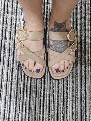 • Dual cross-strap front and instep strap with adjustable gold-tone buckles