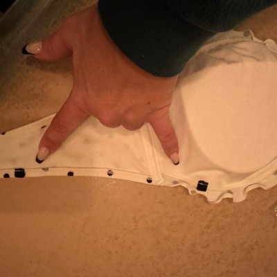 I purchased this women's bikini top online for an in-store pickup. This ruffled bandeau top is so cute, I can't wait to wear it once the wear starts to warm up. The off white top.with black polka dots looks like a throwback to the 50's. It gives quite a bit of coverage and I dont feel like i am left hanging out of it. It has detachable black straps for a little more security, and a big silver clasp to keep it in place. I purchased a size small and it fits great. I wear a 34B and a size small in bathing suits for reference. The price is great and this is a really good value.