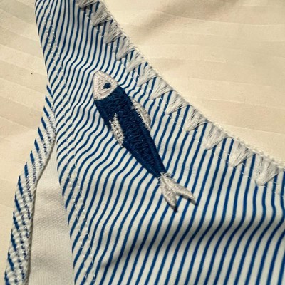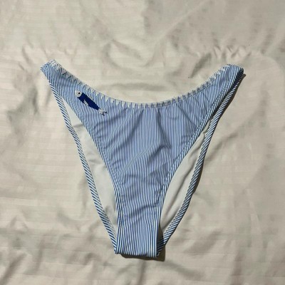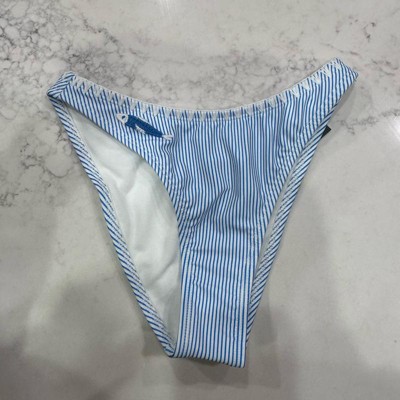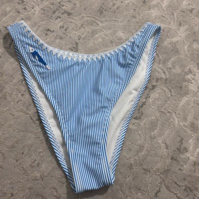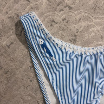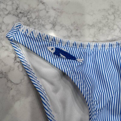Tricot bikini bottom from Wild Fable™ adorned with a blue striped pattern and an appliqued sardine motif with embroidered accents. Features pull-on style for convenient wear. Made from polyester fabric with spandex and full lining for flexible comfort in and out of the water. Extra-cheeky coverage and a low-rise, extra-high-leg silhouette finish off the chic look.