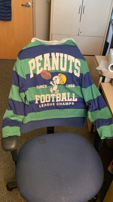 Add a touch of sporty nostalgia to your everyday look with the Women's Snoopy Striped Polo Graphic T-Shirt in Green. Made from soft, lightweight jersey fabric, this tee features classic green and white stripes paired with an adorable embroidered Snoopy detail for a playful nod to the Peanuts gang. The button-down collar adds a preppy finish, while the long sleeves and at-waist length provide comfort and style. With its regular fit and easy pullover design, it’s perfect for layering or wearing solo.