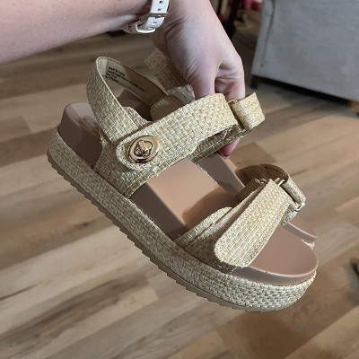 Make every step count with these Tanner Sandals with Memory Foam Insole from A New Day™. These sandals feature double straps with hook-and-loop closures for a secure fit and a cushioned insole for comfortable walking. Designed with an open round toe, these medium-width sandals also boast 1.75-inch platform heels for a statement lift to your height.