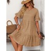 This women's dress features a subtle textured fabric, short ruffled sleeves, a tiered flowy hem, and a relaxed A-line shape. Made of 100% polyester, it¡¯s lightweight, soft, and breathable¡ªideal for warm days. The tiered design adds gentle movement, while the ruffled sleeves bring subtle texture. Perfect for casual outings, brunch, or daytime plans; pairs with sandals or flats.