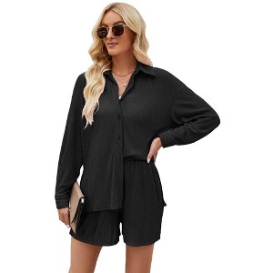 Product Description: Elevate your lounge wear game with our Women's 2 Piece Plisse Set, featuring button-down shirts paired with shorts for a stylish and comfortable summer ensemble. This textured top and pants casual lounge set is perfect for relaxing at home, running errands, or enjoying a casual day out. Crafted from 100% polyester, this set offers a lightweight and breathable feel that is perfect for warmer days. Available in a variety of stylish colors including Black, White, Blue, and more, you can choose the perfect hue to match your personal style. The button-down shirt and shorts co-ord set offers a relaxed and effortlessly chic look, making it a versatile addition to your wardrobe for any laid-back occasion. Find your perfect fit with our size chart: Size S fits 4-6, Size M fits 8-10, Size L fits 12-14, Size XL fits 16, and Size 2XL fits 18-20. Whether you're lounging at home, going for a walk, or meeting friends for a casual outing, our Women's 2 Piece Plisse Set is the perfect choice for a stylish and comfortable look. Embrace leisure in style with this must-have lounge set.