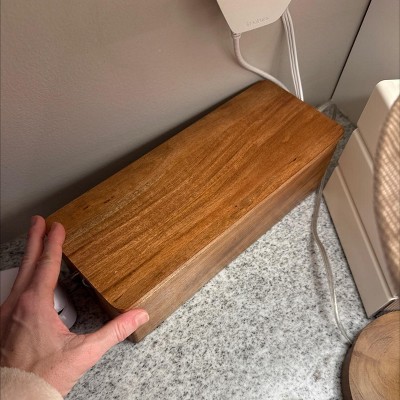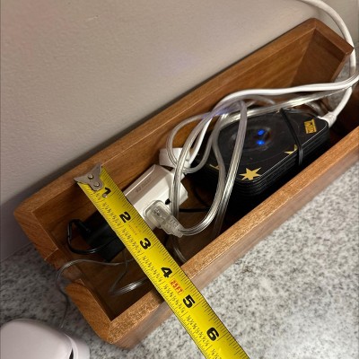 Exceeded expectations for hiding cords. Purchased this to hide a variety of cords on our countertop in our kitchen. We purchased a “house phone” and that came with a lot of u desirable cords. It’s a nice warm brown color and fits more than I expected. Roughly 4 inches wide on the inside if you are trying to determine if a certain attachment will fit. Seems to be good quality and you could probably stack them if needed. I’d say give it a go!
