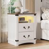Wood Nightstand with 2 Storage Drawers, LED Light, Charger Station & Ceramic Handle, Farmhouse Night Stand