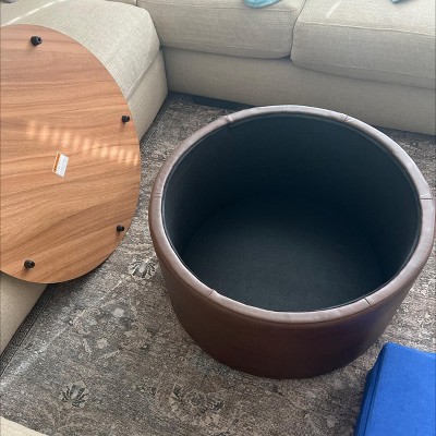 Wood Top Storage Ottoman Brown Faux Leather - HomePop: Modern Round Upholstered Bench, Easy to Assemble