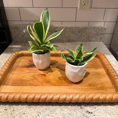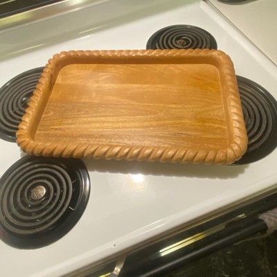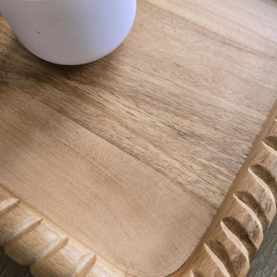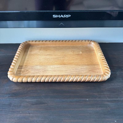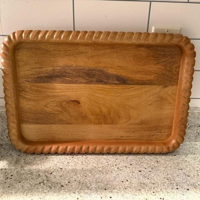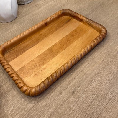 This tray had the perfect dimensions to fit on my entryway console. The wood is a beautiful, warm tone that compliments my decor and the detailed edge gives the tray texture and interest. Get it before it sells out!
