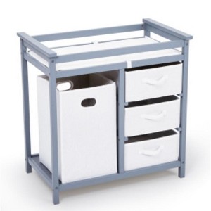 This gray solid wood baby changing table provides a safe, sturdy area for diaper changes. It has storage compartments for essentials, blends with contemporary nursery decor, boasts a non-toxic finish, and ensures long-lasting use for growing babies.