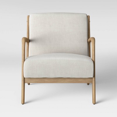 - Designed with a Scandinavian sensibility, this armchair features a solid wood frame in a warm natural finish, gently curved for a soft, welcoming silhouette.