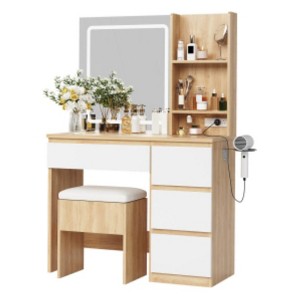 Features a smooth tabletop and integrated storage (drawers/shelves) to organize cosmetics, jewelry and beauty essentials