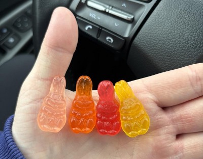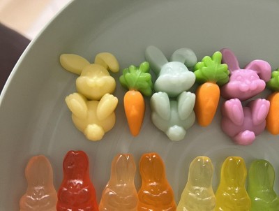 They taste like regular gummy bears, so no complaints there. They are cute and larger than regular bears. The other solid-colored gummies are Albanese Cottontail Gummies. They taste a little different—still good, but I prefer the regular gummy taste.