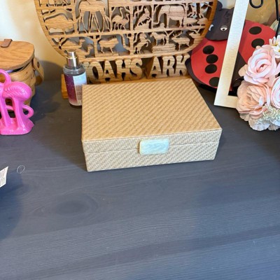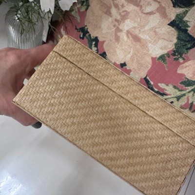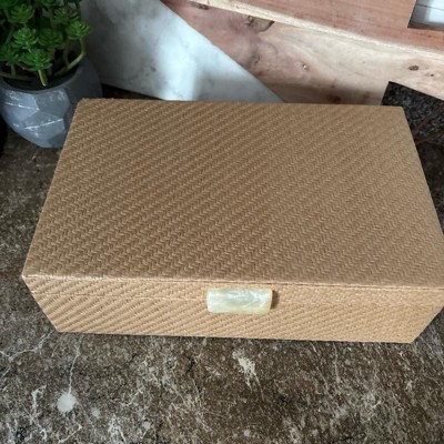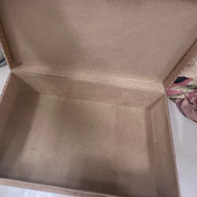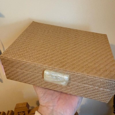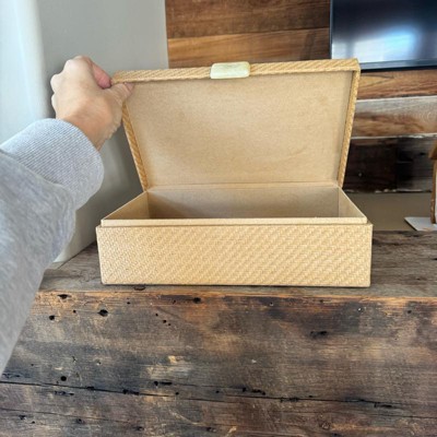 [This review was collected as part of a promotion.] This woven decorative box is super versatile. It can be used in both a feminine or masculine space. the woven exterior is similar to a wider type feel. The inside of the box is lined in a velvety type material. The tip is attached and is easy to open and close. So many options for storing things.