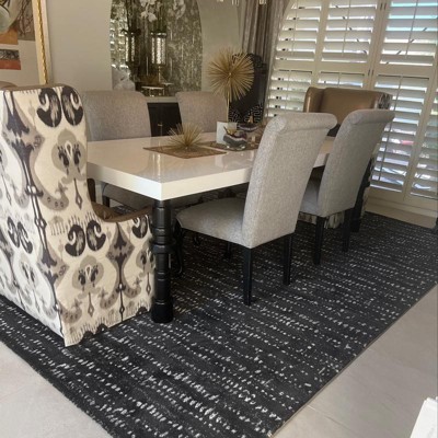 Dress up your floors with this simple and stylish Elle Ikat Rug from Threshold™. Featuring a low pile construction, this striped rug with splatter detail makes the perfect pick for high-traffic areas in your home. This rectangular rug comes with eye-catching, contrasting stripes against a solid backdrop, adding a cool, contemporary flair to your space. This indoor rug lends functional decor to your room, blending easily with any existing decor while adding a touch of textural detail to your space.