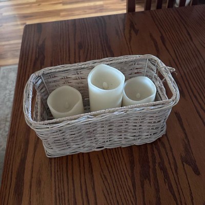 [This review was collected as part of a promotion.] I love this basket. The basket is a distressed white that fits perfectly with my farmhouse themed dinning room. I am planning on putting my battery powered candles in this. It stands a little higher than I was expecting so I will need to add a little something to give the candles some height. The basket is so well made and well worth the money. I this would also be cute in a bathroom with soaps and lotions. I received an incentive to write this review.