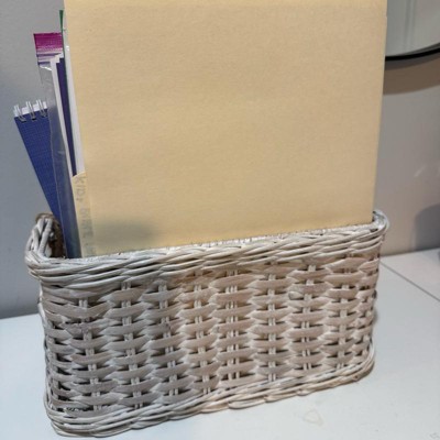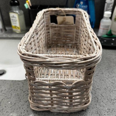 [This review was collected as part of a promotion.] This is a quite small and narrow, whitewashed rattan organization basket. Because of the material it is made of it is quite sturdy. You could use it for storing bathroom supplies (like hair care products) or even for loose papers or stationary items. Because it is smaller, you can easily fit it on top of a desk. Overall, this is a cute storage addition to any space! I received an incentive to write this review.