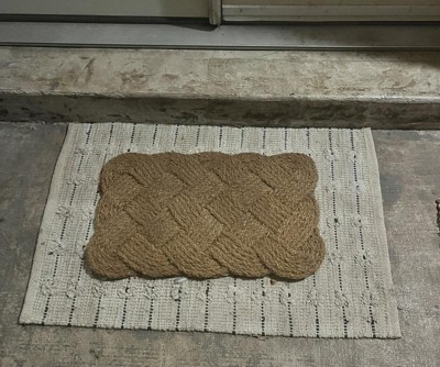 Refresh your space with modern, functional elegance with this Woven Striped Flatweave Rug from Threshold™. Featuring a timeless pattern of black stripes accented with tufted dots on a cream background, the rectangular handmade rug blends seamlessly with just about any existing décor. The woven material provides soft comfort underfoot while adding warmth to hard flooring like tile. This accent rug is perfectly sized for placing in front of your kitchen sink, in your laundry room or by the entrance.