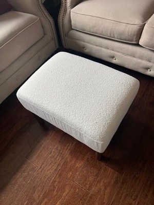 [This review was collected as part of a promotion.] The white square ottoman with a dark brown wooden frame and four legs is a stylish and functional addition to any living space. Its clean, modern design fits well with both contemporary and traditional decor, making it a versatile piece. The sturdy wooden frame ensures durability, while the cushioned top provides comfort for seating or as a footrest.