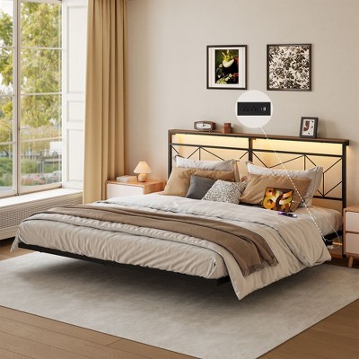 This platform bed frame combines rustic charm with modern functionality, featuring a genuine wood headboard that adds natural warmth to your bedroom. Built around a sturdy metal frame, this bed delivers both durability and timeless appeal. The innovative two-tier storage headboard maximizes space efficiency while keeping essentials within easy reach. Stay connected with built-in 2 AC outlets and 2 USB ports, perfect for charging devices directly from bed. Customize your room's atmosphere with adjustable LED lighting that transitions through various colors and moods. Complete with clear installation manuals, video guides, and all necessary tools, this bed frame assembles easily while offering the perfect blend of rustic character and contemporary convenience.