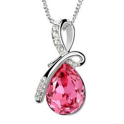 This elegant necklace is uniquely designed and features a dazzling tear-shaped crystal. Tiny crystals also are embedded in the ribbon design above. The necklace is silver plated and contains tin alloy on the inside. Pair the necklace with an elegant evening gown as the perfect finishing piece. Available in a variety of colors. Dimensions: Crystal, 0.56"L x 0.38"W; Pendant 1.06"L x 0.56"W; 16 inch chain with 2 inch extension. Material: Crystal, Silver Plating, Tiny Alloy.