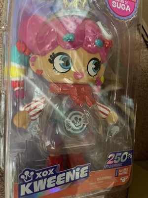 [This review was collected as part of a promotion.] XOX Kweenies Candy Large Doll Suga is a colorful, vibrant, eye-catching 12” tall figure. With moveable arms, legs and swiveling head she stands alone. The collectible display cards and poster are fun additions. The gum balls in her body move around while being safely contained for the safety of little ones.
