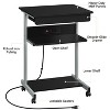 This durable laptop desk table with power outet is made of CARB P2 particle board, durable and solid. Coated with electrostatic spraying powder paint in silver finish, it is elegant and attractive. The comprised 1 drawer for storage and 2 shelves are perfect for storing and displaying. Two of the durable casters are lockable for safety stability and mobility. With premium PVC laminate veneer, this rolling laptop desk is scratch-resistant and water-proof. It is eligible for being used as a laptop table, writing desk or as a dining table, practical and multi-functional. Its simple and stylish design is compatible well with any kind of your decoration décor, easy to assemble under the manual enclosed.