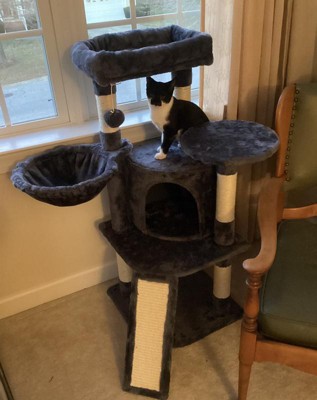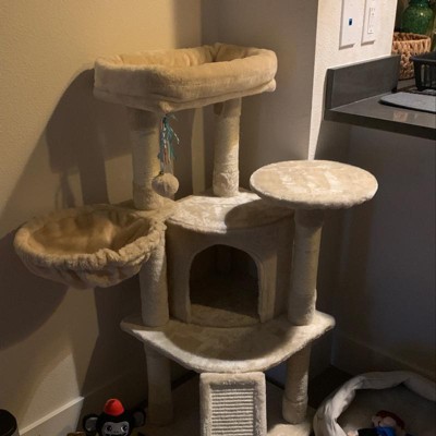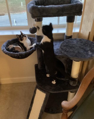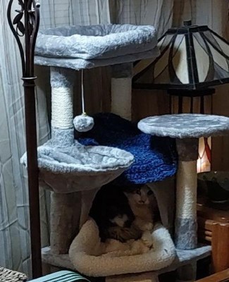 Give your cat a happier, more comfortable space to play and rest with this professional cat tree. Made from selected particle board, covered in soft plush, and secured with anti-toppling accessories, this versatile cat tower offers multiple levels for your beloved cat to have fun or sleep, including a condo, platform, and basket. With several scratching posts and a ramp, it also provides healthy outlets for scratching. This multifunctional cat tree is an ideal addition to your home.