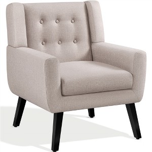Whether you need extra seating in your living room or a comfy reading chair, this button-tufted armchair is up for the job. Its button-tufted winged back, flared wood legs, and cozy linen fabric upholstery add a soothing and elegant touch to any setting. It has a solid and manufactured wood frame and strong rubberwood legs for added stability and firmness. A slanted backrest, extra-deep cushioned seat, and wide armrests offer plenty of comfort and support while reading, socializing, or scrolling through the latest social feeds. This living room chair is upholstered in breathable linen fabric that is soft against the skin. Four sinuous springs support the high-density foam-filled seat cushion, extending its service life. A tasteful look meets a neutral color palette, making this side chair ideal for living rooms, bedrooms, home offices, reading nooks, small corners and more.