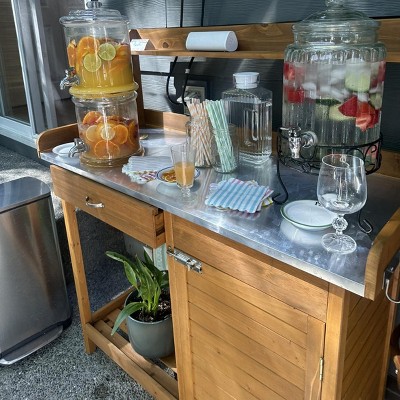 This solid fir wood potting table comes with fine zinc metal tabletop that’ll make home gardening easier. All storage options, e.g. side hooks, open shelves, one drawer and cabinet on each side, keep your gardening tools in an orderly fashion. Take it as an extra table as well to serve tea on your garden gatherings. Free-standing style for moving convenience. Worthwhile investment indeed.