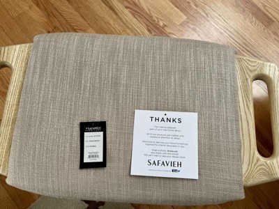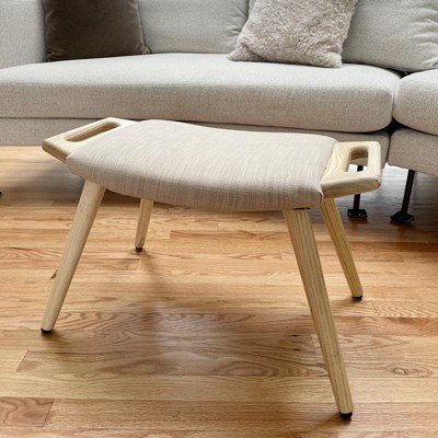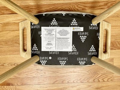 Cute stool. Love the neutral fabric. Legs are a light wood. 3 pages of assembly instructions for screwing in 4 legs ; could save a tree and put on one sheet. Only disappointment was the black backing - would have been better if it was a neutral color since it peeps over the edge and can be seen when viewing at a horizontal perspective. Will probably remove and change.