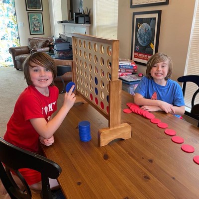 Giant 4 is the blown-up version of the classic table-top 4-in-a-row game. This giant game, however, can be played on the floor indoors or out in the yard! This Giant wooden board is made with premium wood and finished with natural stain is the perfect classic tabletop game for outdoor entertainment. The board measures approximately 3 feet wide by 2 feet tall. The Red and Blue coins are 3 inches in diameter. 2 players (or teams) drop coins from the top of the board, alternating turns trying to get 4 in a row. To win, you or your team must be the first to connect 4 or your color coins in a horizontally, vertically, or diagonally row. Simply slide out the wooden bottom bar when finished to release the coins. Store the coins in the game when finished playing. This wooden game is perfect for parties, BBQs, tailgating, group events, camping, and much more.