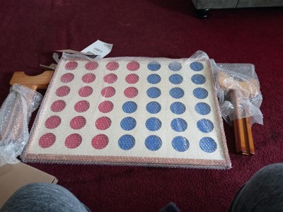 - • INCLUDES: Giant wooden board 31 x 23-inches, beautifully finished legs and frame, 21 red and 21 blue 3-inch plastic coins, and a nylon carrying case