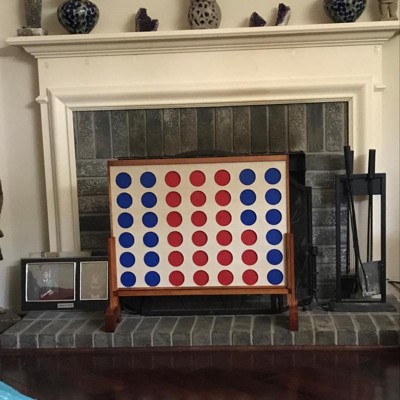 Giant 4 is the blown-up version of the classic table-top 4-in-a-row game. This giant game, however, can be played on the floor indoors or out in the yard! This Giant wooden board is made with premium wood and finished with natural stain is the perfect classic tabletop game for outdoor entertainment. The board measures approximately 3 feet wide by 2 feet tall. The Red and Blue coins are 3 inches in diameter. 2 players (or teams) drop coins from the top of the board, alternating turns trying to get 4 in a row. To win, you or your team must be the first to connect 4 or your color coins in a horizontally, vertically, or diagonally row. Simply slide out the wooden bottom bar when finished to release the coins. Store the coins in the game when finished playing. This wooden game is perfect for parties, BBQs, tailgating, group events, camping, and much more.
