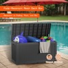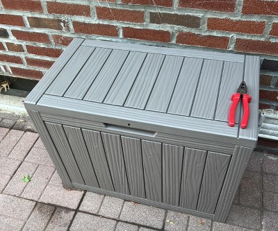 This deck box is sturdy, weatherproof, and just the right size for storing pool toys and patio cushions. The material feels durable and the UV resistance is a big plus. I love the side handles—they make it easy to move around. The secure lock hole adds peace of mind. Highly recommend for anyone needing sleek and functional outdoor storage!