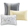 Elegantly update your bedroom with the 7pc Monroe Embroidered Comforter Set. A beautifully embroidered floral pattern is showcased on the faux silk comforter. The pieced design adds a lovely contrast and texture to the ensemble. The solid reverse complements the enticing design seen on the top of the comforter and continues gracefully down to the bed skirt. Matching shams bring the unique style of the comforter to the head of the bed, giving it a truly luxurious look. Three decorative pillows with intricate embroidery, pleating, and piecing, complete this exquisite comforter set.