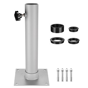 Features:- Base for Flagpole & Parasol - Universal Deck Mount Flagpole Base, fits pole with diameter of 2 3/8" (6 cm), both for stably holding flagpole and umbrella pole on concrete ground;Includes 1 set of plastic sleeves for making it fit for thinner poles of 1 5/16", 1 5/8" to 1 15/16" in diameter- Easy & Sturdy Installation - 4 Predrilled holes on the base for simple installation; Anchor bolts for steadily fixating the base into the concrete- Durable in Use - Heavy duty metal body with baking varnish avoids getting rust; Rubber ring on the joint to prevent water from permeating inside screw thread;Tightening screw knob provides a smooth, wobble-free adjustment for better stability;- Classic Appearance - Baking varnished surface brings smooth texture to the surface, perfectly compatible with metal and wooden poles- Wide Application - An excellent base to hold flagpole, for expressing your patriotic feelings, sharing your support for political candidate; Ideal for holding flag outside the public institution, such as school, city hall, Expo site and so onSpecifications:- Overall Dimension(LxWxH): 7 1/16" x 7 1/16" x 15 15/16" (18 x 18 x 40.5 cm)- Sleeve Inner Diameter: 1 5/16", 1 5/8", 1 15/16" (33, 41, 49 mm)- Tube Size(DiaxL): 2 9/16" x 15 9/16" (6.5 x 39.5 cm)- Tube Inner Diameter: 2 3/8" (6.1 cm)- Tube Thickness: 1/16" (0.2 cm)- Base Size(LxWxH): 7 1/16" x 7 1/16" x1 5/8" (18 x 18 x 4.1 cm)- Base Thickness: 3/16" (0.4 cm)- Base Height: 1 3/8" (3.5 cm)- Screw Hole Diameter: 1/2" (1.2 cm)- Center-to-Center Length of Screw Hole: 6 3/16" (15.7 cm)- Net Weight: 6.4 Lbs (2.9 kg)Package Contents:- 1x Base- 1x Tube- 4x Anchor Bolts- 1x Rubber Ring- 1x Manual- 1 Set of SleevesNotice: - This flag pole base is suitable for pole with diameter of 2 3/8" (6 cm), which might be unsteady for pole less than 2 3/8" (6 cm) in diameter.