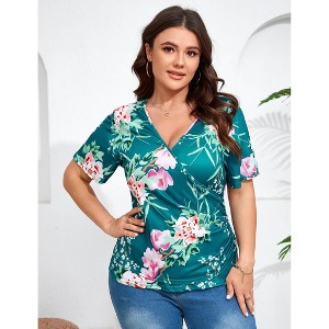 YESFASHION Women Plus Size Blouse V Neck Floral Top Short Sleeve Elegant Criss Collar Shirt - 1 of 4