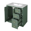 This bathroom vanity is built for long-term use, with a solid wood frame and high-quality MDF parts ensuring sturdiness that saves you from reselecting a vanity anytime soon. Its 30'' ceramic undercounter basin adds practicality—smooth, easy to care for, and non-fragile—plus it fits 4'' center faucets perfectly to match your bathroom style. Storage is abundant and smart: three drawers hold daily necessities, and one cabinet accommodates medium/large items, all concealing toiletries to keep them safe from bathroom water stains and dust. Durability is boosted by soft-close doors and drawers with a water-resistant paint finish, standing up to daily moisture and use.