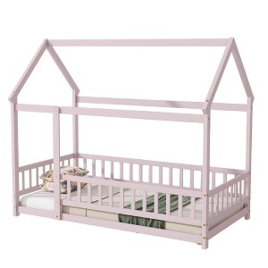 YOOCOZZ Twin Size Rubber Wood House Floor Bed with Roof Frame and Safety Guardrail