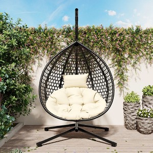 This versatile hanging egg chair is designed for both indoor and outdoor use, offering a stylish and comfortable retreat for relaxation. The intricate hollowed-out design enhances airflow and adds a modern touch, making it perfect for warm days or indoor settings. The chair features a sturdy iron base for exceptional stability and durability, and is crafted from high-quality PE rattan that resists weather, UV rays, and wear. An adjustable headrest ensures personalized comfort, whether you're reclining for a nap or sitting upright to read. The chair's cozy design maximizes space efficiency and provides a unique floating sensation. Assembly is easy with clear instructions and provided hardware.