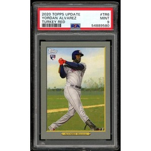 The Yordan Alvarez Rookie Card from the 2020 Topps Update Turkey Red series, numbered TR-6, is a sought-after collectible for baseball enthusiasts, featuring the promising Houston Astros slugger in a classic design. Graded a PSA 9, this card offers collectors a high-quality piece showcasing Alvarez's entry into Major League Baseball during his rookie year.
