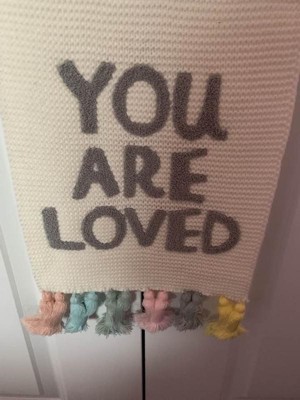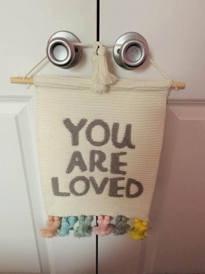 Make a positive statement accenting the wall of your nursery with this 'You are Loved' Fiber Wall Art from cloud island™. The vertical wall decor features the text "You Are Loved" in bold letters for charming style, along with colorful tassels detailing at the edge and top for charming texture and flair. It features a string attached to the wooden dowel at the top, giving you a compelling fixture that's easy to hang on any wall.