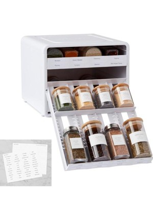 [This review was collected as part of a promotion.] The YouCopia Spice Organizer is a great way to keep spices neat and easy to find. The drawers pull down and tilt for easy accessibility and the dividers are adjustable to accommodate bottles of all sizes. The only disappointment is that spice bottles are not included.