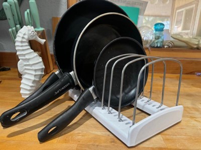 [This review was collected as part of a promotion.] This rack is wonderful for saving space in your cabinets. It makes it much easier to find the pans you’re looking for. It keeps everything well organized.