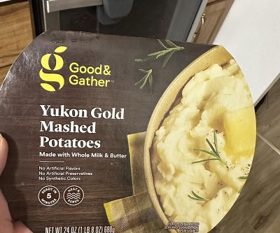If your family loves mashed potatoes but you hate the prep work of peeling, boiling and smashing potatoes, Yukon Gold Mashed Potatoes from Good & Gather™ are great to keep on hand. Unlike making mashed potatoes from scratch, these Yukon mashed potatoes are ready in minutes, letting you get them on the table quicker and allowing you giving you more time to get other parts of your meal ready. The premade mashed potatoes are made with whole milk, real butter and a dash of spice for a homemade taste you and your family are sure to enjoy. Best of all, they contain no artificial preservatives, flavors or synthetic colors.Directions Heat & Serve1. Puncture film and microwave on HIGH for 3 minutes.2. Carefully remove film and stir.3. Microwave uncovered 1 minute longer or until hot.4. Let stand 1 minute before serving.Caution: product and package will be hot.Microwave ovens may vary; adjust cooking times accordingly.Refrigerate or discard leftovers immediately.