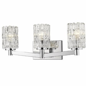 A contemporary haven is bejeweled with glam as this exquisite three-light vanity light becomes a focal point in a custom bath space. Crystal-like glass shades add an air of exclusivity to a fixture with a beautiful Brushed Nickel finish metal mount and arms, and an air of high-class, upscale elegance. Bathroom/Powder Room Mounting Direction: Up/Down Shade Included: Yes Dimmable: Yes