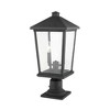 Sleek design makes way for a tasteful accent while illuminating exterior walkways and patio areas. This black post light offers a charming village motif and a candelabra base with bulb sockets for two lights. Room Recommendation: Outdoor Living/Deck/Patio Dimmable: Yes Shade Included: Yes Material: Glass, Finish Color: Black, Width: 9.5", Height: 21.5", Fitter Size: 3 Inch", Lamping Type: Incandescent, Number Of Bulbs: 2, Wattage: 60 Watts, Dimmable: Yes, Moisture Rating: Wet Rated