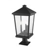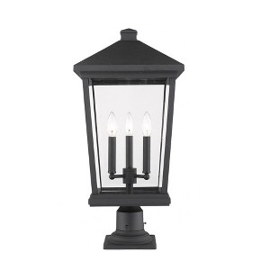 Make sure guests are not in the dark as you throw an outdoor soiree. Perfect for a walkway or garden, this black finish outdoor post light delivers a sweet village ambiance with a clear view of a three-light candelabra bulb base. Room Recommendation: Outdoor Living/Deck/Patio Dimmable: Yes Shade Included: Yes Material: Aluminum, Finish Color: Black, Width: 12", Height: 25.5", Fitter Size: 3 Inch", Lamping Type: Incandescent, Number Of Bulbs: 3, Wattage: 60 Watts, Dimmable: Yes, Moisture Rating: Wet Rated