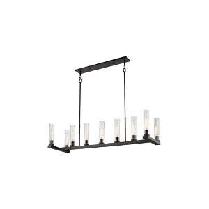 A classic candlestick motif delivers romantic flavor to the Beau nine-light island/billiard light, an exceptional fixture styled to create a theatrical mood in an entertaining or kitchen space. Bring the lore of industrial-inspired rustic charm with a contrast of bronze finish steel and sparkling clear fluted glass shades, all arranged in a linear fashion. This light frames a kitchen island, billiards table, or any element in a custom living area. Cord Length: 170.00 Rod Length(s): 2-3, 2-6, 4-12, 8-24 Dimmable: Yes Shade Included: Yes