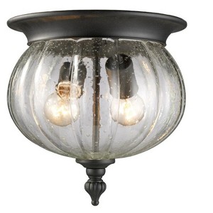 This cast aluminum outdoor flush mount uses reed seedy clear glass to create a unique look, along with the black finish and decorative finial. Outdoor Living Shade Included: Yes Dimmable: Yes Material: Aluminum, Finish Color: Black, Width: 10", Height: 9.75", Hanging Method: Flush, Lamping Type: Incandescent, Number Of Bulbs: 2, Wattage: 60 Watts, Dimmable: Yes, Moisture Rating: Damp Rated