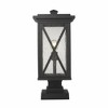 This one-light outdoor pier mounted fixture has a square, tiered base, and comes in a box-shaped black aluminum cage with a clear seedy glass finish. It softly diffuses light to provide a welcoming glow to your front entrance or patio. Compelling X-accents bring dimension and character. Outdoor Living/Deck/Patio Shade Included: Yes Dimmable: Yes
